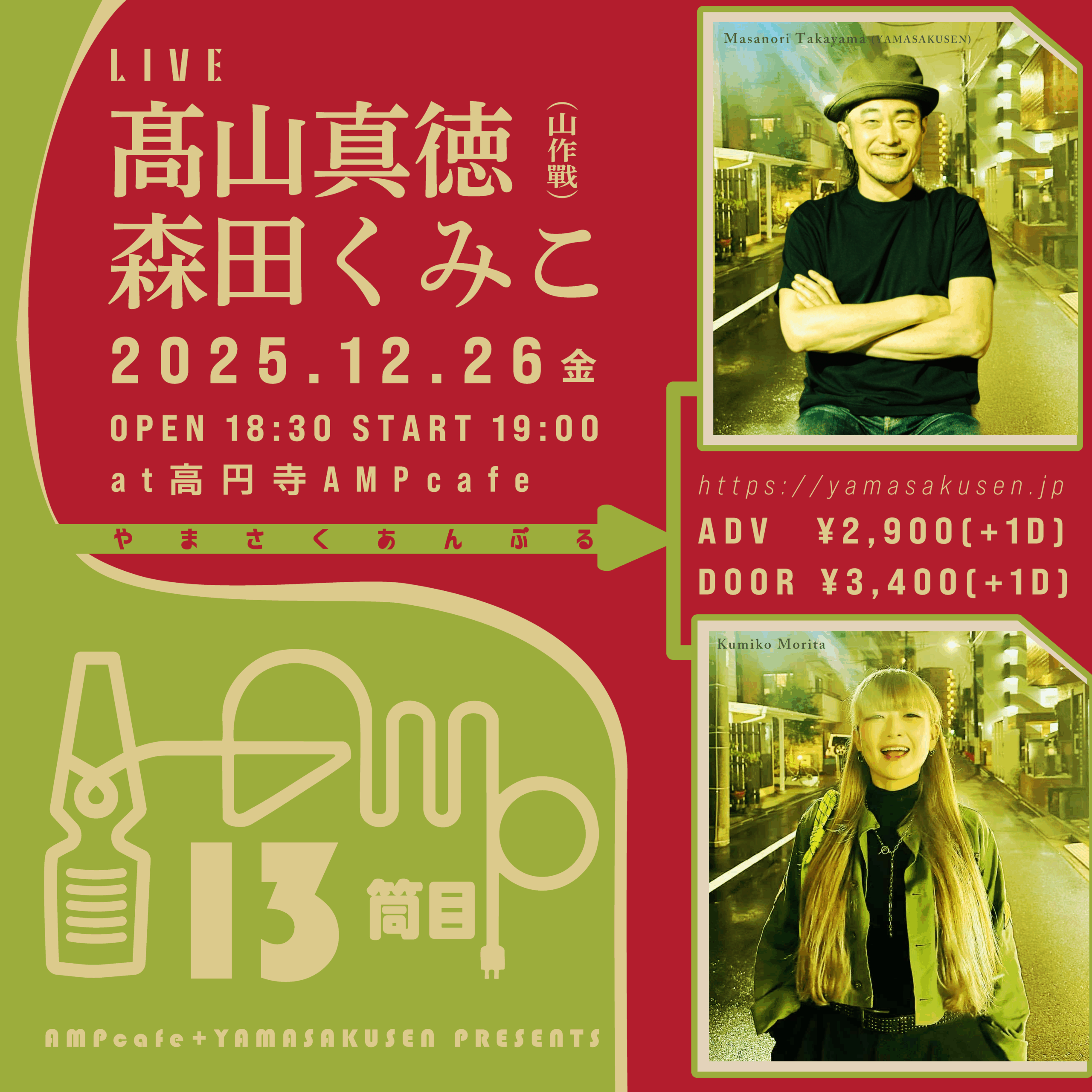 2025.12.26 (金)AMPcafe×山作戰 presents 「やまさくあんぷる」13筒目 高円寺AMPcafe 〒166-0003 東京都杉並区高円寺南4丁目30−1 開場19:00 開演19:30 前売¥2,900+1D 当日¥3,400+1D 出演:森田くみこ、髙山真徳